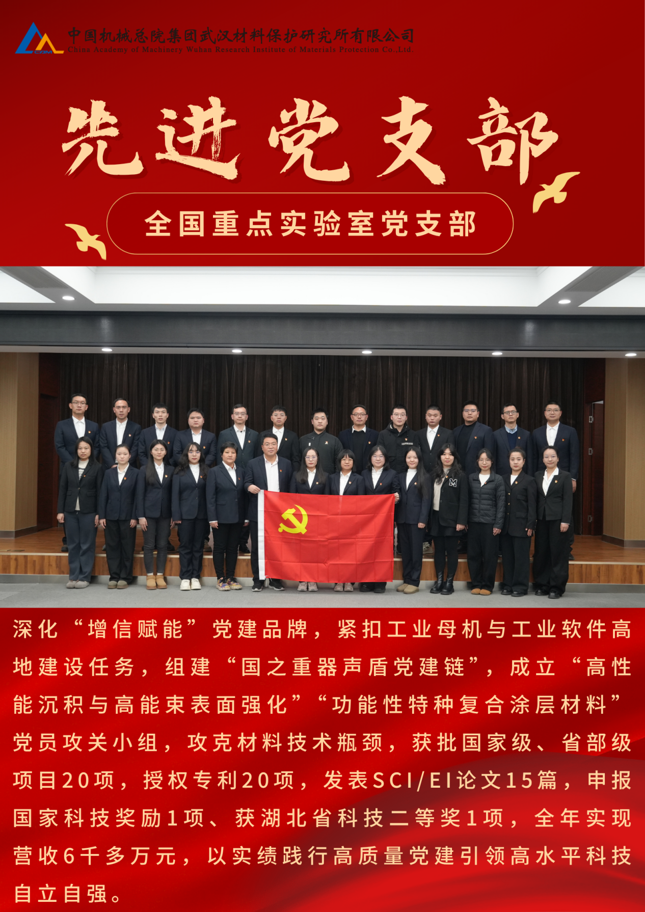 2025年,全国重点实验室党支部以习近平新时代中国特色社会主义思想为指引,深化“增信赋能”党建品牌,紧扣工业母机与工业软件高地建设任务,充分发挥支部战斗堡垒作用和党员先锋模范作用,以高质量党建引领高水平科技自立自强,成效显著。支部强化思想铸魂,依托“三会一课”、主题党日等载体,开展联学共建、理论学习活动13次,结合链上党建、书记领学等形式,推动党的创新理论入脑入心;严格落实党风廉政建设,实现党员廉洁教育、问题整改双100%覆盖,作风建设走深走实。聚焦主责主业,聚力打造高性能沉积与高能束强化原创技术策源地。向外深化“链上党建”协同机制,组建“国之重器声盾党建链”,联合研发国内首台激光熔覆-磨削协同制造装备。向内靶向成立“高性能沉积与高能束表面强化”“功能性特种复合涂层材料”党员攻关小组,研发等离子喷涂、高速喷熔等4台套硬装备,攻克防火防腐、超低热导率热障涂层等材料技术瓶颈,为我国重大工程与重点型号“铸甲”。坚持党管人才,凝聚群团力量,引育硕博士9人、培养青年干部3人,培育多名省市级人才。全年实现营收6156万元、增幅约20%,获批国家级、省部级项目20项,授权专利20项,发表SCI/EI论文15篇,申报国家科技奖励1项、获湖北省科技二等奖1项,绘就党建与科研深度融合的发展蓝图。