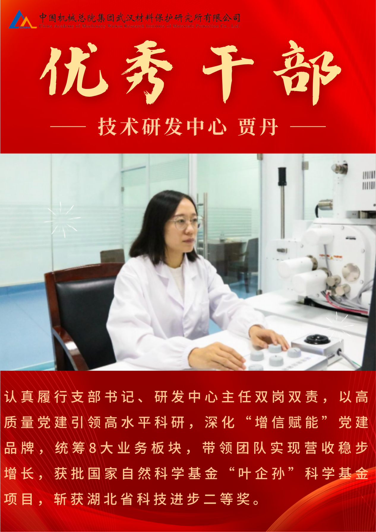 贾丹同志身兼双职、双向发力,以高度的政治责任感和务实担当,彰显党员先锋本色,带领团队在2025年取得突出业绩。作为支部书记,她深化“增信赋能”党建品牌,依托“三会一课”“链上党建”和党员攻关小组,推动党建与科研深度融合,严格落实廉政建设要求,凝聚群团力量,培育优秀人才梯队,助力支部攻克多项关键技术。作为研发中心主任,她统筹推进功能聚合物、耐磨电刷镀等8大业务板块,带领团队实现年度营收增长率达22%。作为第一完成人斩获湖北省科技进步二等奖,获批国家自然科学基金“叶企孙”科学基金项目。她深耕科研一线、言传身教,指导青年科研人员成长,推动形成结构合理、素养优良的科研梯队,用实干担当践行初心使命,兼顾党建引领、科研攻坚与人才培育,为高水平科技自立自强贡献央企力量。