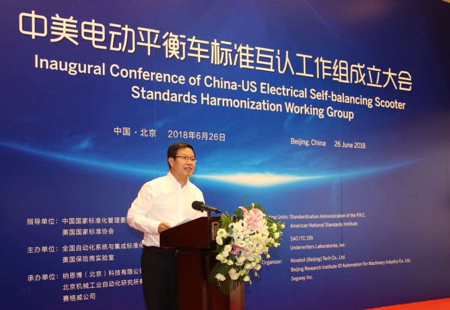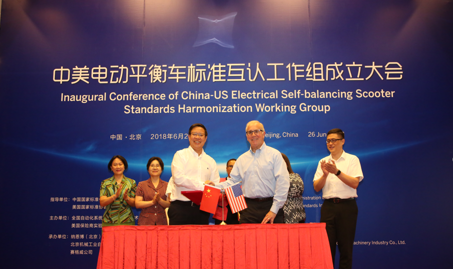 6月26日,中美电动平衡车标准互认工作组成立大会在北京唯实大厦成功举行。全国自动化系统与集成标准化技术委员会主任委员、米兰体育(中国)总院集团董事长王德成与美国保险商实验室全球副总裁 Philip M.Piqueira分别代表中美双方签署电动平衡车标准互认合作协议。中国国家标准化管理委员会副主任殷明汉、IEC美国国家委员会副主席Sonya Bird、美国大使馆参赞Cynthia Griffin、北京航空航天大学教授王田苗、全国自动化系统与集成标准化技术委员会秘书长黎晓东、Segway-Ninebot公司总裁王野等领导及电动平衡车国家标准起草组专家出席会议,共同见证了中美两国标准化合作的历史时刻。