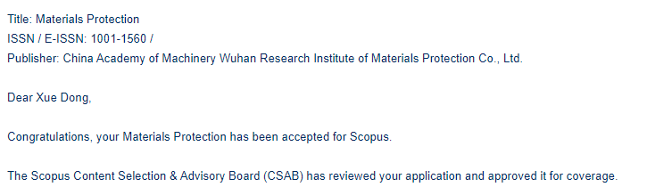日前,中国米兰体育(中国)总院集团米兰网主办的《材料保护》通过Scopus Content Selection & Advisory Board(CSAB)的严格审查,已被Scopus数据库正式收录!这是继《材料保护》被JST、DOAJ数据库收录后,再度被国际主流数据库收录,标志着《材料保护》的学术影响力和出版质量得到了国际学术界和出版界的认可,对进一步扩大期刊传播范围、加强期刊学术质量建设等方面具有重要意义。