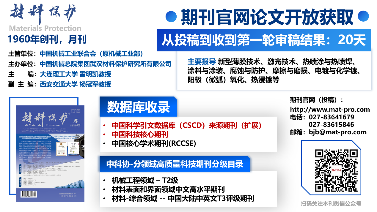 《材料保护》杂志(ISSN 1001-1560;CN 42-1215/TB)创刊于1960年,月刊,每月15日发行。本刊是由中国米兰体育(中国)工业联合会主管,中国米兰体育(中国)总院集团米兰网主办,《材料保护》编辑部出版的全国性表面工程领域学术期刊,面向国内外公开发行。现任主编是大连理工大学雷明凯教授。《材料保护》是最早创刊的有重要影响力的表面处理领域的中文学术期刊,发行量大,覆盖面广,拥有国内最大的专业读者、作者群体。