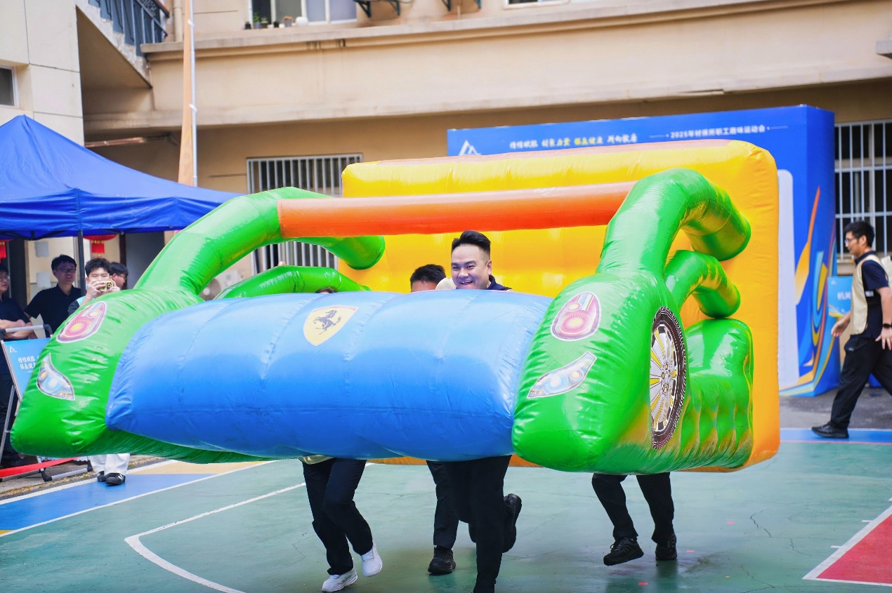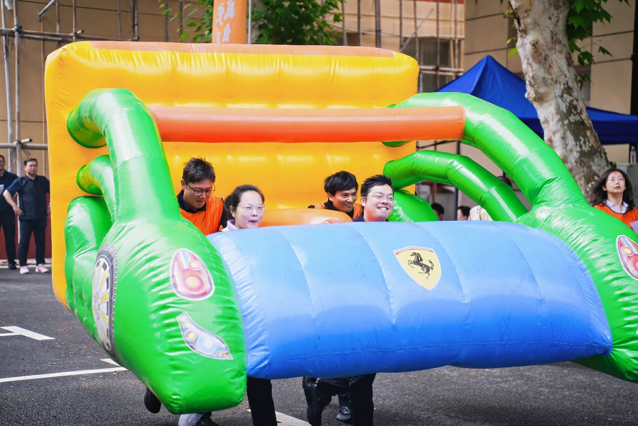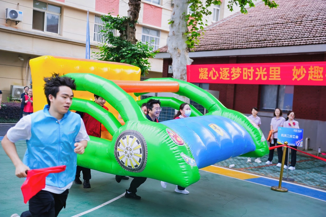 这是一场充分展示速度与协作的激战。各队第一组4名运动员需要合力将充气车控制向前,当到达终点后,转交给第二组队员,由第二组队员合力将充气车返回至起点。赛场上各队队员齐心协力、奋勇向前,场外观众的欢呼助威声一浪高过一浪。机关一分工会步伐出奇一致,充气车直冲向终点,力压群雄,以最短时长顺利摘得桂冠。“充气车考验的不是蛮力冲刺,而是劲儿往一处使的巧劲儿!”分工会主席李丹赛后笑着总结。