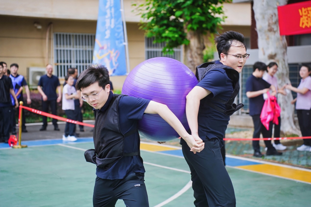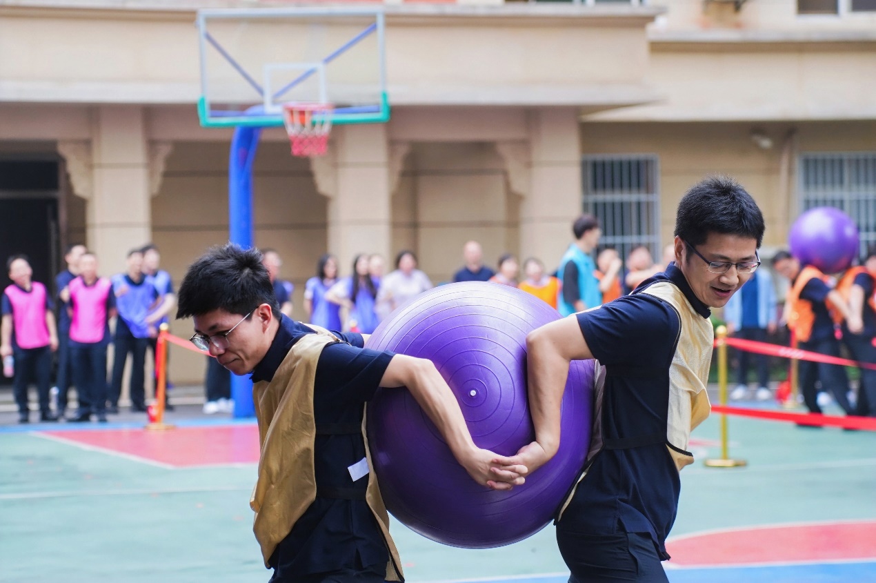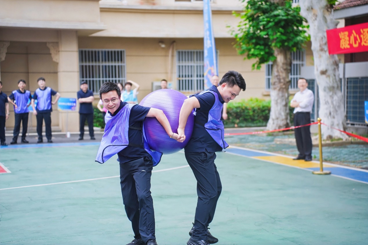 如果说“不倒森林”考的是反应,“鼎力前行”则是一场“策略+体力”的综合战。两名队员为一组背对背牵手,用上半身夹紧瑜伽球,通过协调配合在跑道上行进,到达终点线后换下一组队员重复完成比赛。裁判一声令下,跑道上瞬间爆发出此起彼伏的笑声与加油声。最有趣的协作,从来不是“各自为战”,而是“背靠背,一起向前”。全国重点实验室分工会在这场“没有硝烟的贴贴战役”中以最“亲密”的姿态再次夺得优胜,点燃了全场热情。