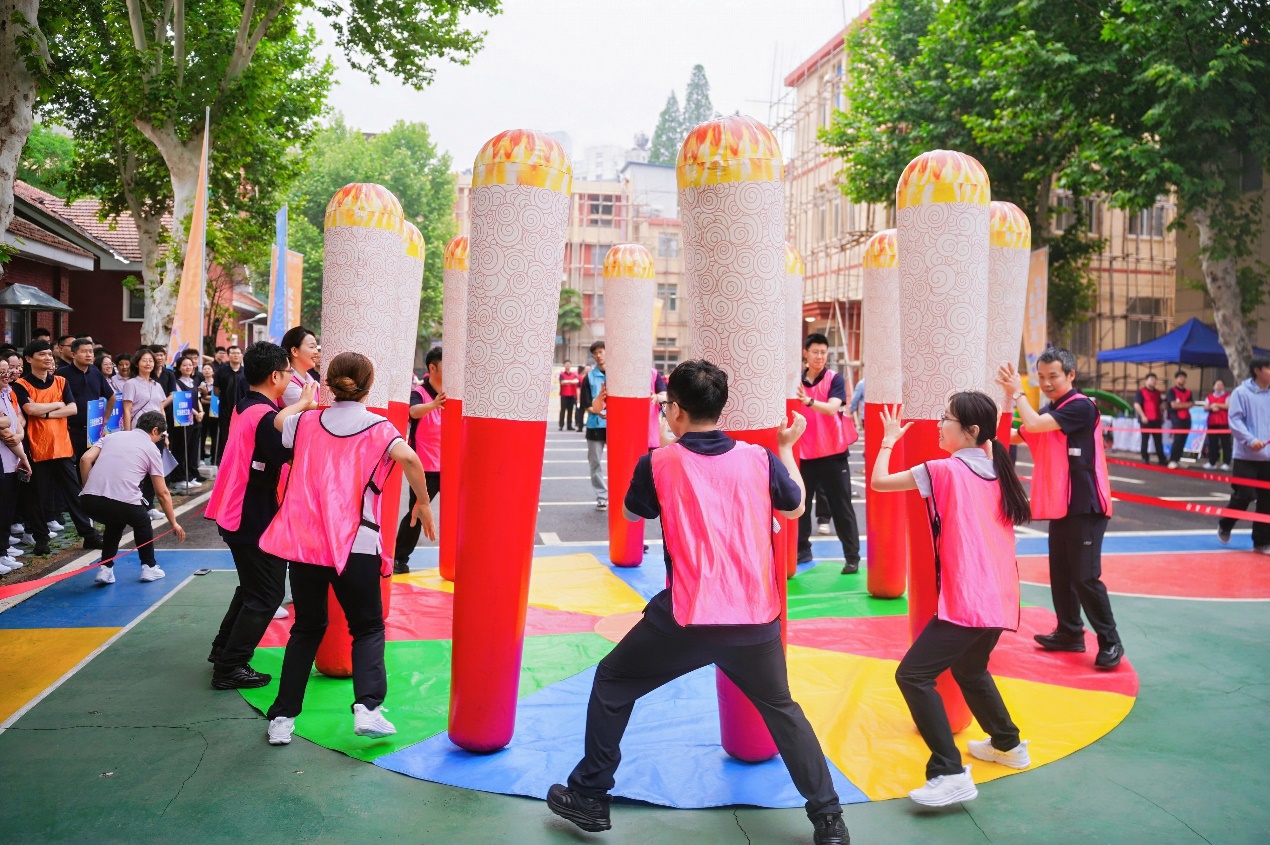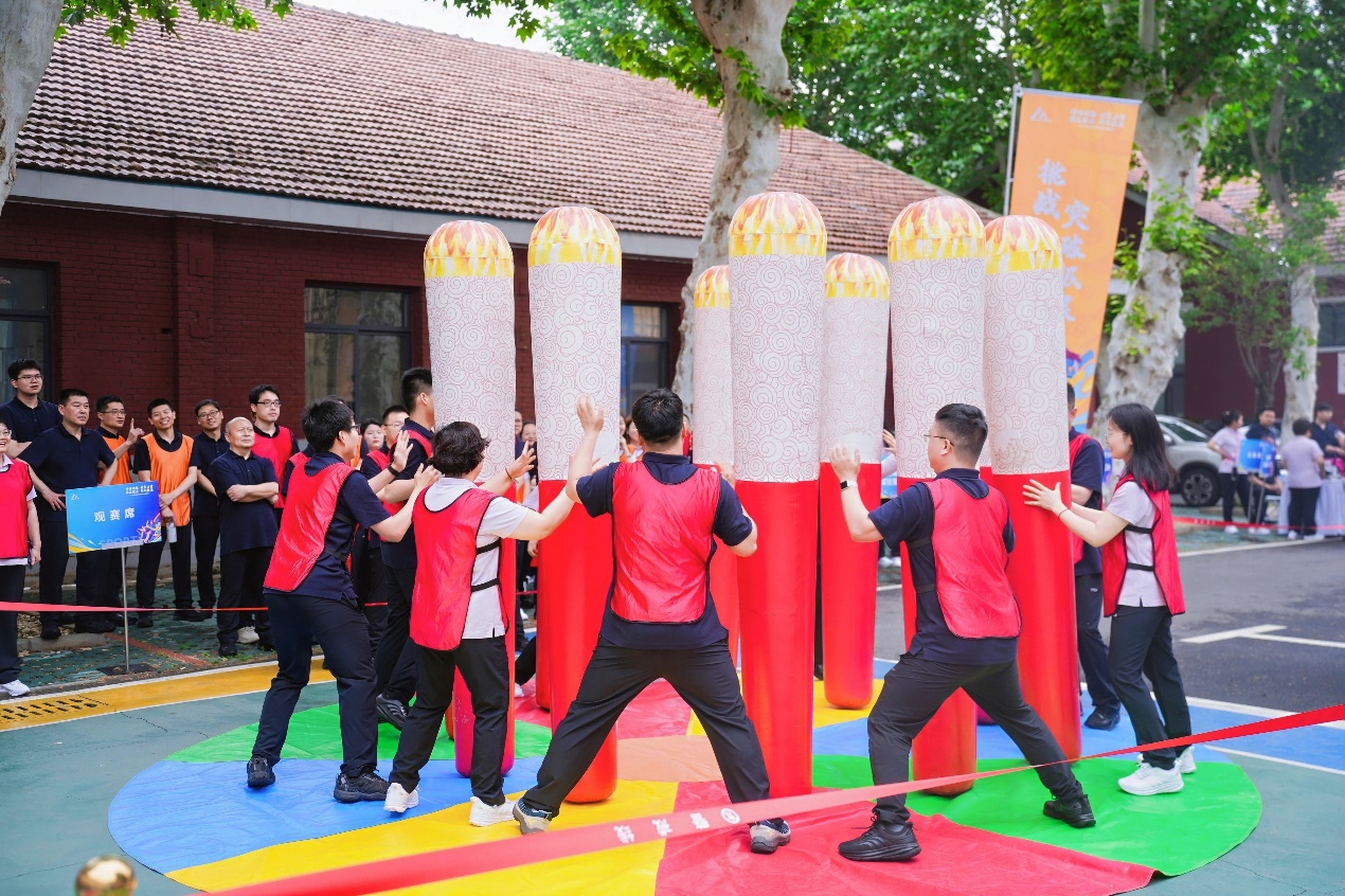 “左手扶,右手接!”,赛场上的呼喊声此起披伏。作为首个登场的项目,“不倒森林”要求队员轮流抽离自己的充气柱,同时接住下一位队员松开的柱子,全程不能让任何一根柱子倒地。经过4轮激烈比赛,7支队伍全部完成挑战,全国重点实验室分工会以“零失误”和最短时长摘得首项桂冠。“这就像部门沟通协调——慢一点没关系,关键是要同步频率,充分信任。”分工会主席吴军赛后感慨。