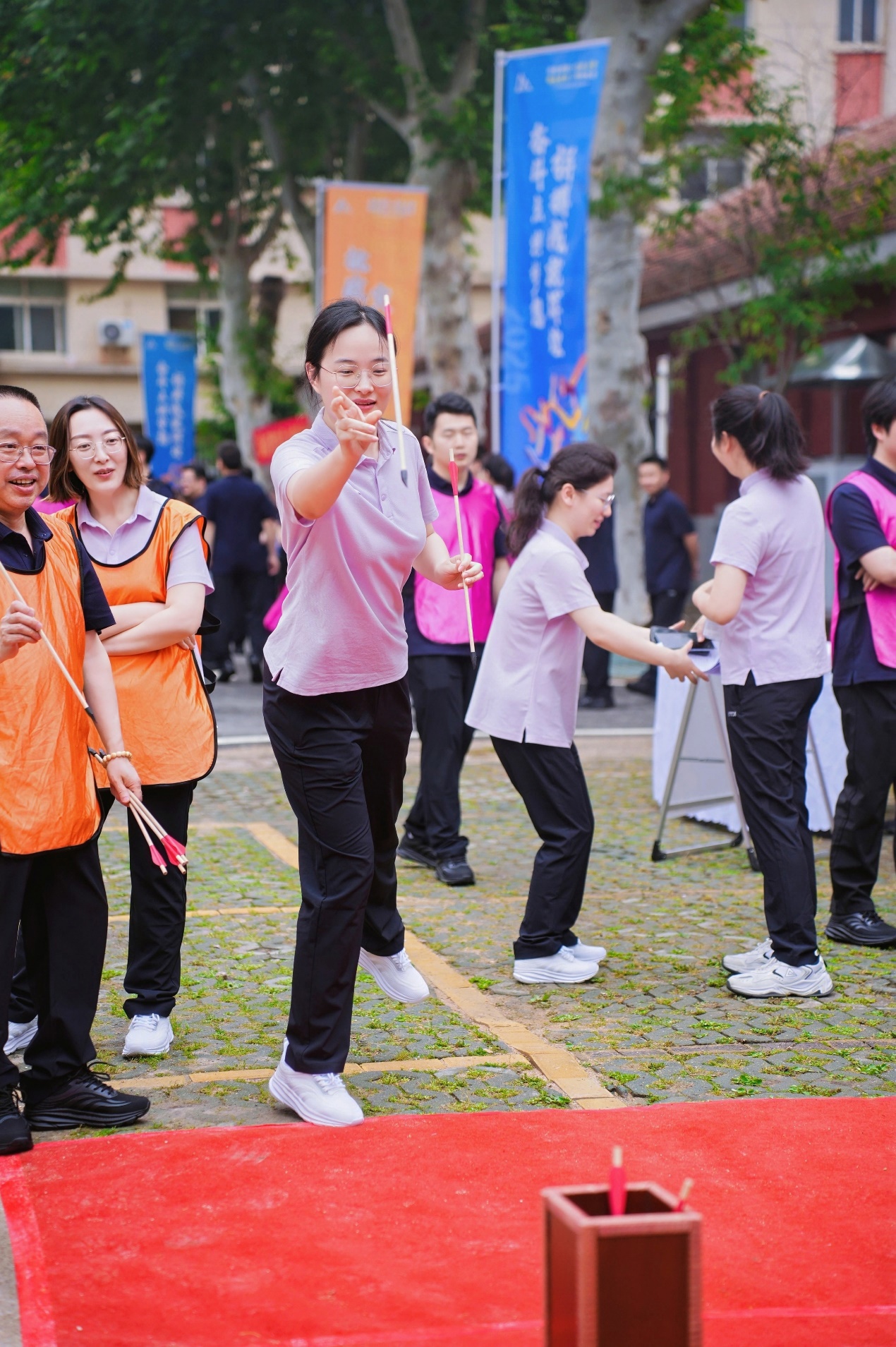 投壶:古风项目计入“团队加分项”,每人轮流投掷5支箭矢,按合计投入壶口内数量排名计分。活动现场,直径约15厘米的壶口成为众人眼中的“小目标”。表面材料分工会的汪洋首投便稳稳命中,“唰”一声箭矢斜插壶中,引来场边“好箭法!”的阵阵欢呼。机关二分工会的宋薇连中两箭,兴奋不已的她握拳与场下队友击掌,赛场的互动温暖了全场。