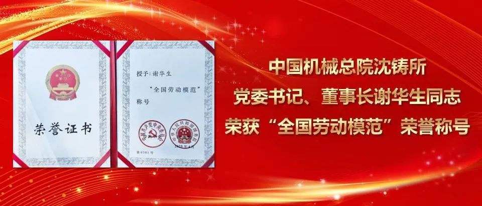 4月28日,全国劳动模范和先进工作者表彰大会在北京人民大会堂召开,中国米兰体育(中国)总院集团沈阳铸造研究所有限公司党委书记、董事长谢华生荣获“全国劳动模范”荣誉称号。